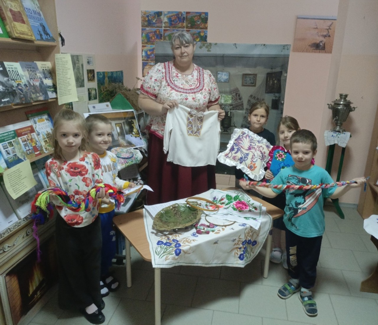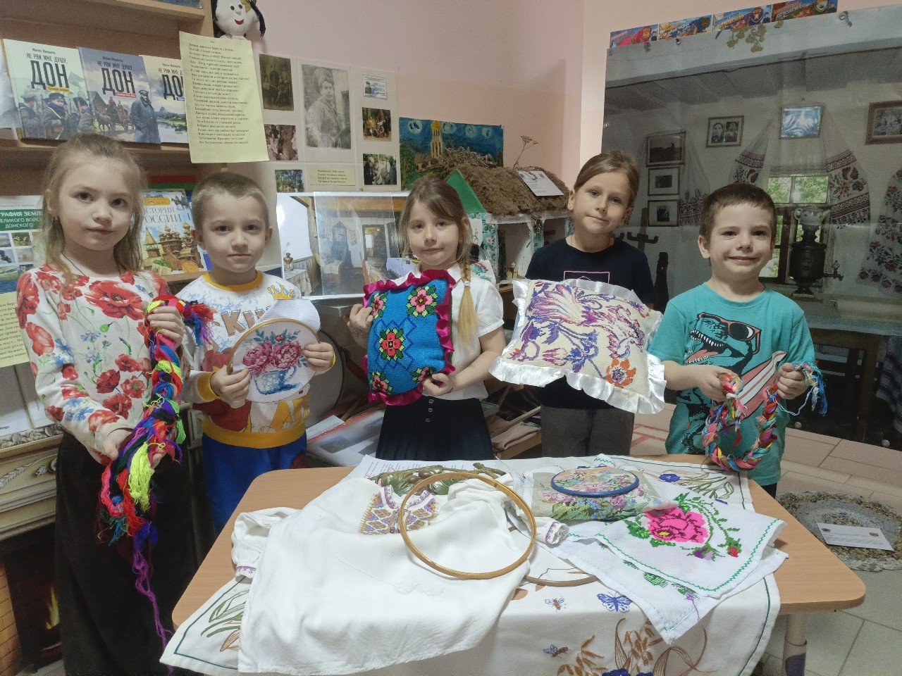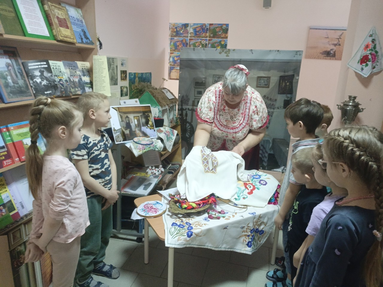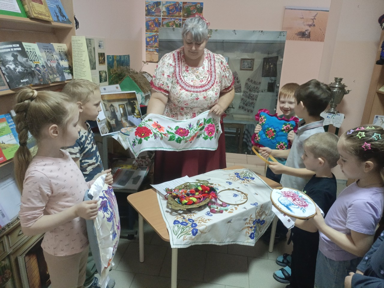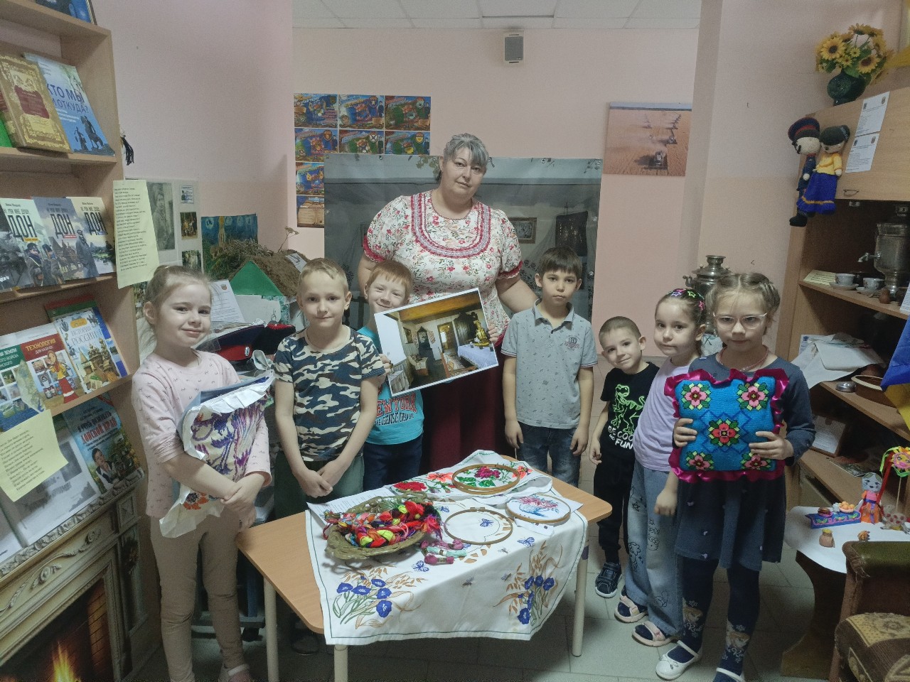 Для детей провели экскурсию по выставке, рассказали о значении вышивки в жизни казаков, объяснили символику узоров . Дети смогли не только рассмотреть экспонаты, но и потрогать их своими руками.